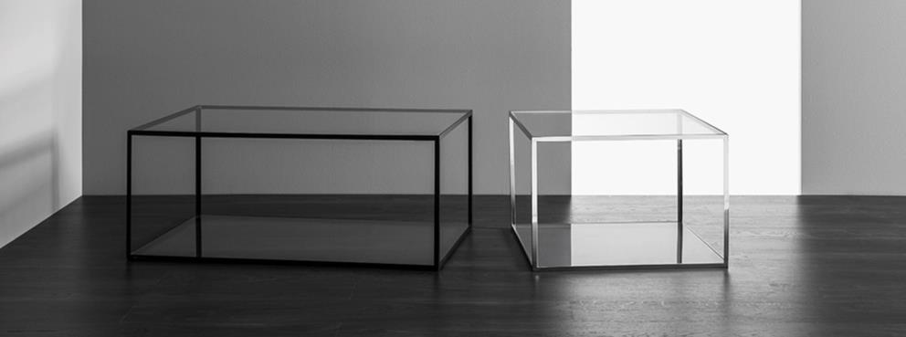 這是一款採用鉻或黑色金屬的經典方形桌,頂部和底部以玻璃製成。