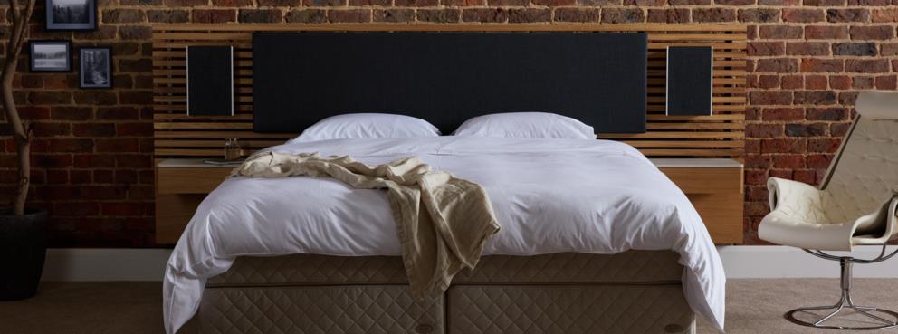 這款床頭板是兩大產業領導者合作的結晶。極簡設計結合創新音響技術和支撐性襯墊,增進舒適感。